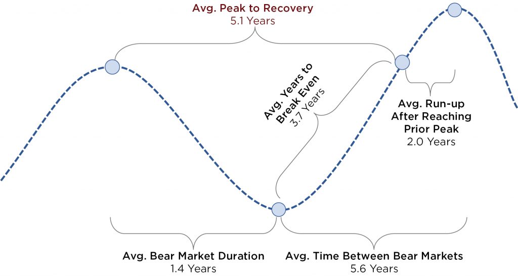 On average, the market takes 5.1 years to get back to whole from the start of a bear market (and 3.7 years from the bottom). Investors who were patient through even the worst bear markets saw the market return to previous peaks and reach new highs.