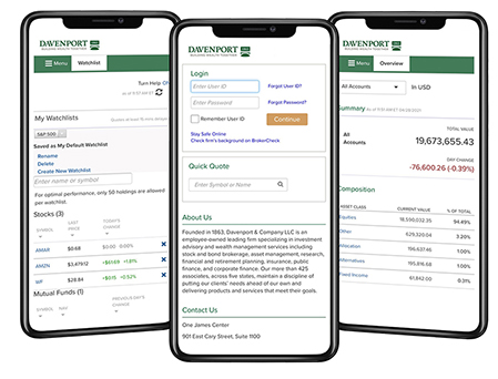The Davenport Mobile App gives you greater accessibility to your account information, allows you to set up a watch list for your favorite stocks, displays market data and quote information, and allows you to deposit checks from your mobile device into your account.