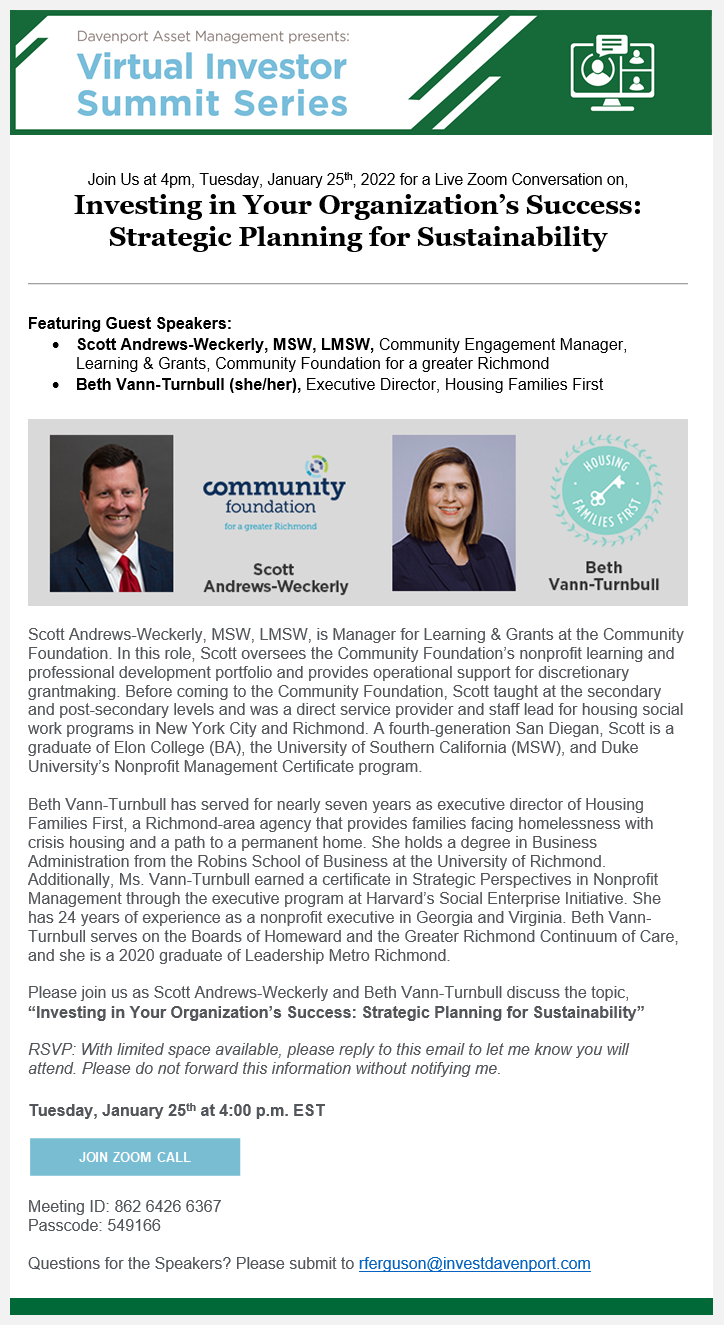 Investing in Your Organization’s Success Invitation email template [featured_image] Download Download is available until [expire_date] Version Download 58 File Size 546.50 KB File Count 1 Create Date January 4, 2022 Last Updated April 30, 2024 Investing in Your Organization's Success Invitation email template