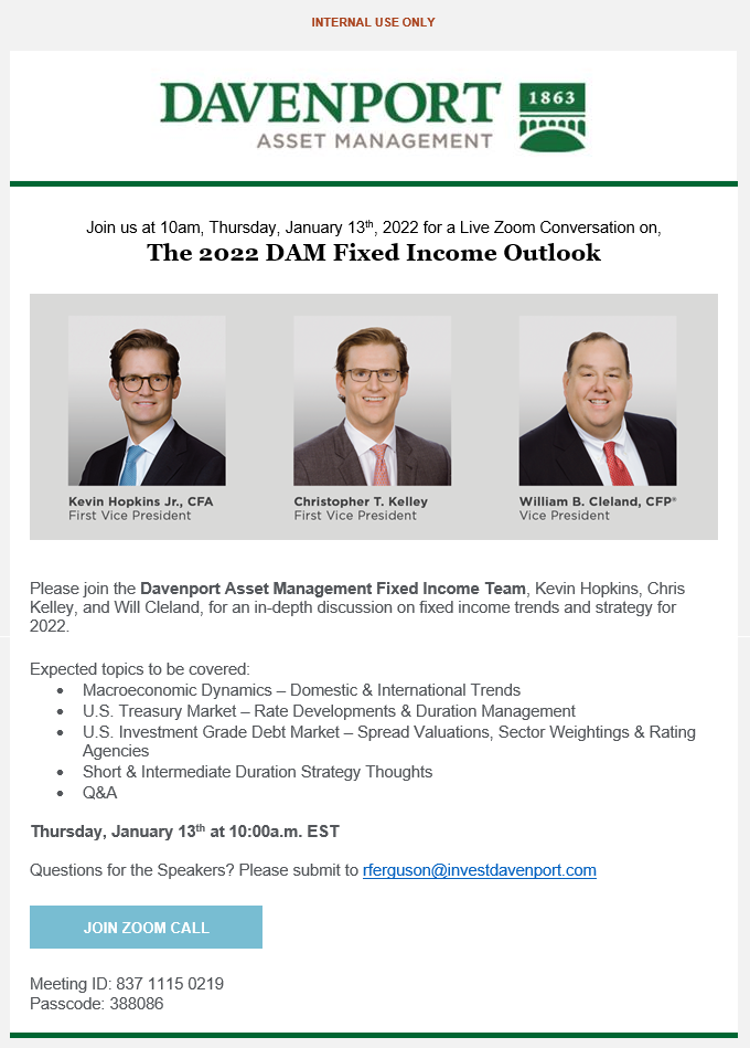 The 2022 DAM Fixed Income Outlook Invitation email template [featured_image] Download Download is available until [expire_date] Version Download 33 File Size 1.03 MB File Count 1 Create Date January 4, 2022 Last Updated April 30, 2024 The 2022 DAM Fixed Income Outlook Invitation email template