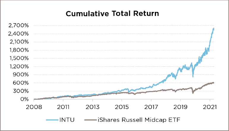 In the Davenport Equity Opportunities Fund (DEOPX), we rely on our deep research process to uncover quality businesses with strong balance sheets, run by capable management teams that can compound shareholder capital at high rates of return. Once a business is identified, we employ a strict valuation discipline to ensure we pay a “fair” price or better. While we are not perfect, the stars have aligned nicely in certain instances throughout the Fund’s history, allowing us to deliver attractive returns with less risk. Below, we highlight our experience with long standing holding, Intuit Inc. (INTU), which illustrates what happens when we get it right.
